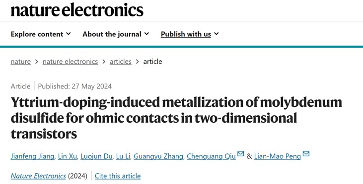 彭练矛院士-邱晨光研究员课题组在二维半导体集成工艺方面提出了“稀土钇元素诱导相变理论”,并发明了“原子级精准选区掺杂技术”,突破了传统离子注入掺杂结深无法小于5纳米的工程限制,首次将源漏选区的掺杂深度推进到单原子层0.5纳米极限,并基于二维半导体晶圆规模化制备出超短沟道弹道晶体管,实现了理想的欧姆接触和开关特性,有潜力构建未来更高性能、更低功耗的亚1纳米技术节点芯片。相关研究成果以“Yttruim-doping-induced metallization of molybdenum disulfide for ohmic contacts in two-dimensional transistors”为题,2024年5月27日在线发表于《自然·电子学》(Nature Electronics,原文链接://www.nature.com/articles/s41928-024-01176-2)。姜建峰博士与徐琳博士为共同第一作者,邱晨光研究员和彭练矛院士为共同通讯作者,18漫画