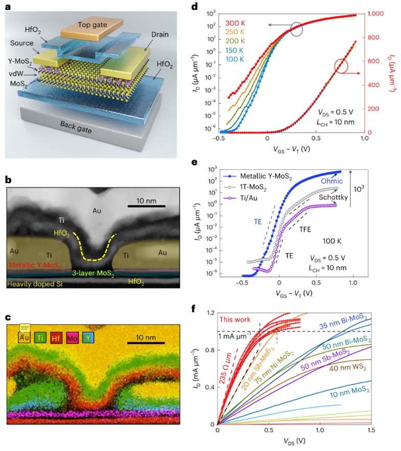 1.开创性地提出了“稀土元素诱导二维金属化理论”。该技术通过钇原子掺杂诱导的方式,将接触区域的二维半导体转变为二维金属。并以此二维金属作为金属与半导体之间的缓冲层,抑制了界面处的费米钉扎效应,该缓冲层作为“桥梁”,有效地提高了载流子从金属到半导体的传输效率。钇原子掺杂有效调控了二维金属的费米能级的位置,以实现理想的能带对齐和器件的欧姆接触,克服了本征二维相变固有肖特基势垒的科学挑战。