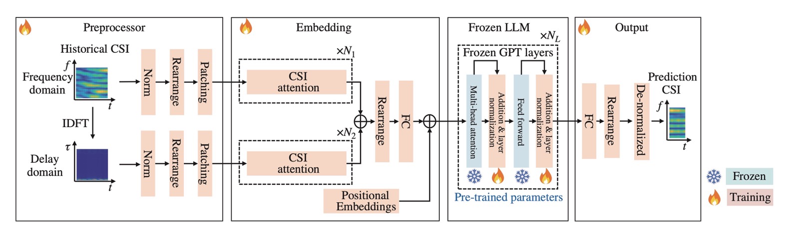 图1:所提出的基于预训练大语言模型的信道预测网络框架