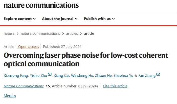 张帆教授课题组与上海交通大学电子工程系未来光网络团队、鹏城实验室研究团队合作,在相干光传输领域取得重要进展,研究成果以“Overcoming laser phase noise for low-cost coherent optical communication”为题,发表在《Nature Communications》期刊上。该研究成功解决了相干光通信系统中激光器相位噪声影响这一基本问题,为实现高速、低成本的相干光通信技术提供了有力解决方案。