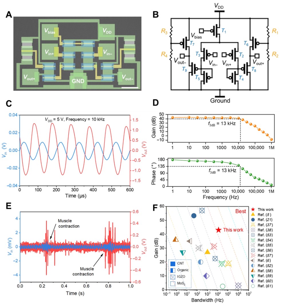图2. A)柔性差分放大器的显微镜图,标尺100 μm;B)差分放大电路结构示意图;C)柔性差分放大器的差模信号输入和输出波形图;D)柔性差分放大器的增益和相移波特图;E)肌电信号放大前后波形图;F)不同材料的柔性差分放大电路增益和带宽对比;