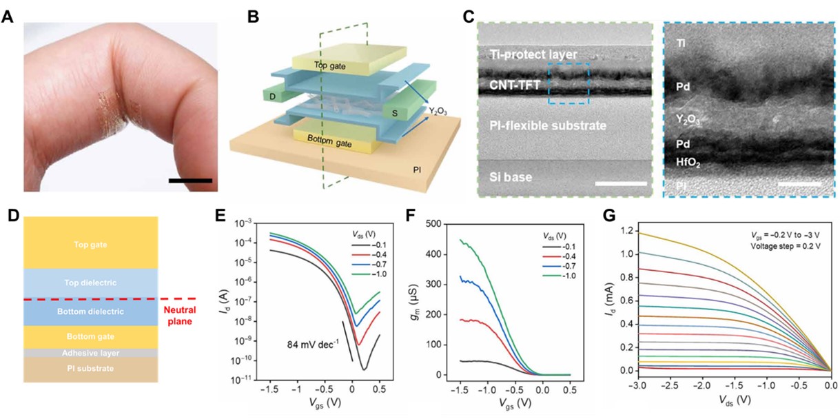 图1. A)贴敷于指关节的极薄柔性碳纳米管器件照片,标尺1 cm;B)双栅柔性薄膜碳纳米管晶体管的结构示意图;C)器件的截面透射电子显微镜图,标尺100 nm,20 nm;D)器件叠层示意图;E)器件的转移特性曲线图;F)器件的跨导特性曲线图;G)器件的输出特性曲线图;