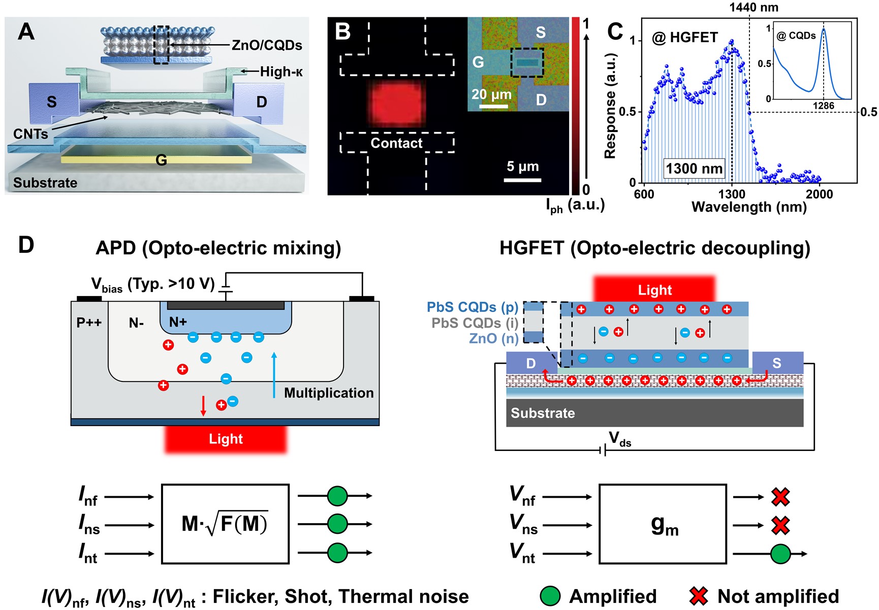 为了满足高端被动短波红外成像的需求,传感器必须同时具有高响应度和低噪声,获得极高的信噪比/比探测率,以实现对微弱红外光的探测(晴朗星光,<10⁻⁸W·Sr⁻¹·cm⁻²·μm⁻¹)。当前主流的外延型短波红外探测技术依赖于单晶的铟镓砷(InGaAs)PN型光电二极管,由于缺乏本征增益,其比探测率很难达到5×1013Jones,难以满足星光探测需求。雪崩光电二极管(APD)虽然在大偏压下通过“雪崩”效应产生了光电流的倍增,但在“光电混合”的架构下,由于载流子的随机电离这类器件表现出更大的过剩噪声,依然很难实现灵敏度的大幅度提升。近年来,基于新型低维材料的光电晶体管不仅与硅基读出电路工艺兼容,并具有较高的本征增益,但由于其缺陷主导的工作机制、且光传感和电放大单元直接接触,面临增益带宽积受限、噪声被放大(杂质散射等)的困境。