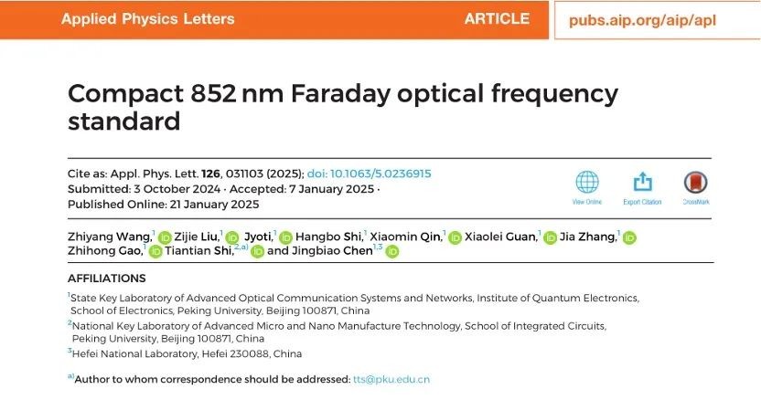 2025年1月21日,18漫画 陈景标教授团队在AIP出版社旗下的国际学术期刊《Applied Physics Letters》上,同时发表了光钟研究两项成果:“A 780 nm optical frequency standard based on diffuse laser cooled87Rb atoms”和“Compact 852 nm Faraday optical frequency standard”。陈景标教授团队提出了与光晶格原子钟和离子光钟完全不同的两种光钟新方法,相比光晶格原子和离子光钟,原理上仅需一台激光器或加上移频、不需要昂贵的PDH系统。低成本和低复杂性的特点,具有空间站、星载、舰载、机载场景等实际平台的应用潜在优势。