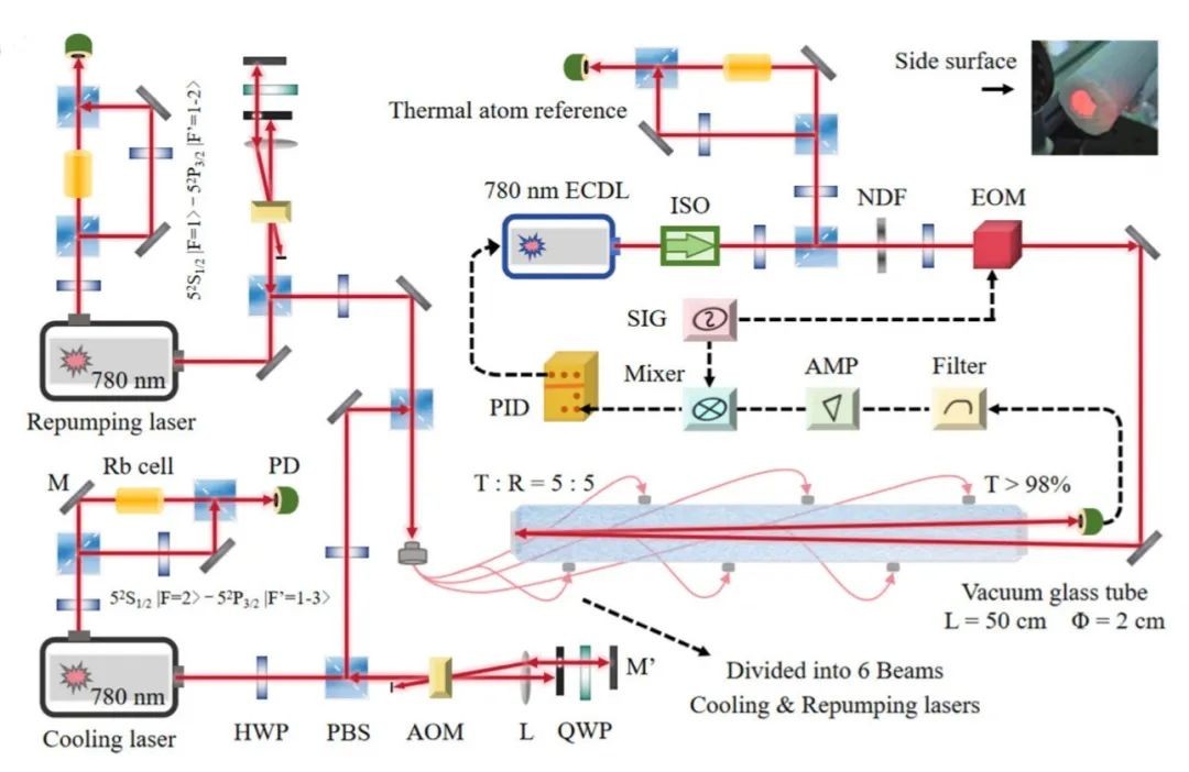 将激光冷却原子技术与频率调制谱稳频技术相结合,利用各向同性的漫反射激光冷却,在一个ϕ2 cm ×l50 cm的真空玻璃管内获得一个50 cm长的冷原子团。通过探测冷原子频率调制谱,并将外腔半导体激光器的输出频率锁定在87Rb 52S1/2(F=2)至52P3/2(F’=3)循环跃迁,最终实现了环内秒级频率稳定度为3.3×10-15的冷原子光频标,6000秒内的峰峰频率波动小于50 Hz。该方案仅用3台相同波长的780 nm冷却、重泵、探测激光器(后续可通过移频减少至1台)即可满足冷原子的制备以及光频标信号的产生。漫反射激光冷却原子光钟的稳频激光器系统,一旦应用了18漫画 自主发展的原子选频法拉第激光器,相比光晶格和离子光钟将更加简单、可靠。