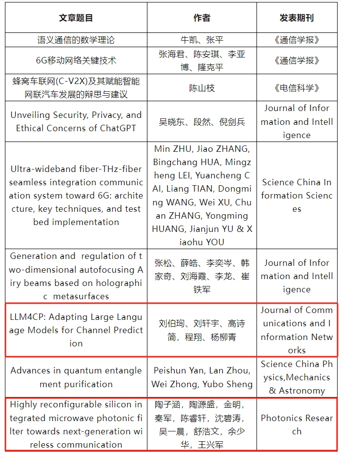 程翔教授团队发表在期刊Journal of Communications and Information Networks上的论文LLM4CP: Adapting Large Language Models for Channel Prediction和王兴军教授团队发表在期刊Photonics Research上的论文Highly reconfigurable silicon integrated microwave photonic filter towards next-generation wireless communication均成功入选。