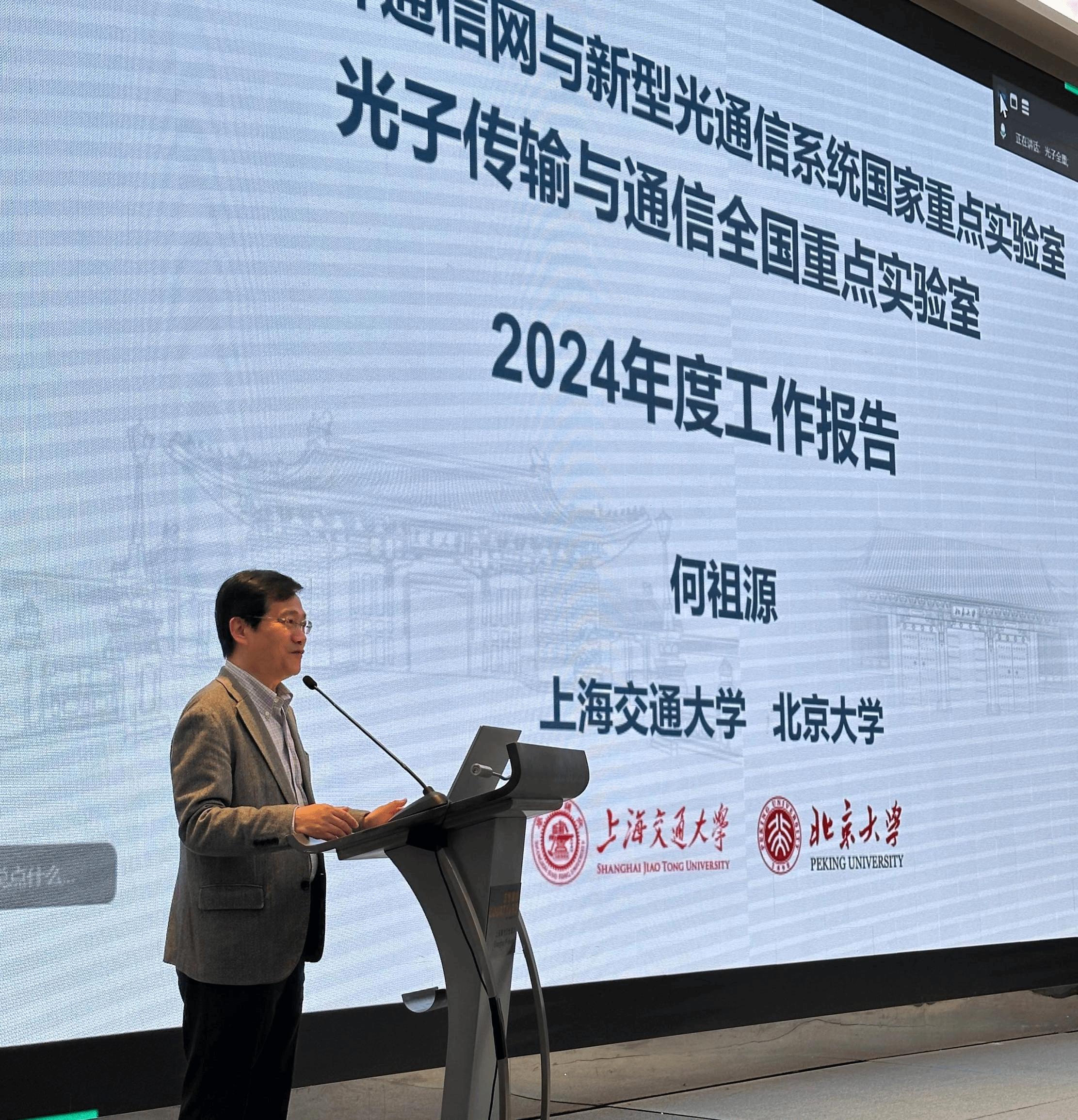 年度工作报告后,诸葛群碧教授、朱逸萧副教授、舒浩文副教授及陆梁军副教授分别以《基于大模型的光网络全生命周期智能体管控现网示范》《克服激光器相位噪声的相干光传输系统》《高性能硅基光电子器件与系统》及《用于大容量数据传输的DWDM系统级芯片》为题,报告了实验室2024年度取得的代表性研究成果。