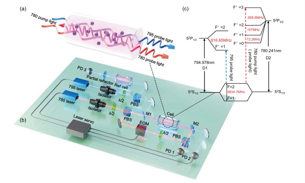该工作成功展示了在单一量子系综中实现多个波长标准的创新方法,通过在不同量子跃迁之间的实现调制,首次基于单一量子系综实现了双光学波长量子频率标准。在这一过程中,泵浦光束的调制频率边带与87Rb D2线(780 nm)共振,并同时传递到780 nm(与87Rb D2线共振)和795 nm(与87Rb D1线共振)探测光束上。借助调制双转移新技术,780 nm和795 nm激光在热原子系综中实现了同时稳频,频率不稳定度都达到10-14量级(根据残余误差信号估算)。此方法开辟了单量子系综多波长频率标准新方向,首次在单一原子气体池中实现了双波长激光稳频,开创了多跃迁协同锁定的新范式,为在同一系统中实现多个量子频率标准、增强量子相干性、量子信息资源的增效利用提供了新的思路。未来,团队将进一步探索其中的基础物理原理及其复杂的相互关系,以推动量子精密测量技术的进一步发展。