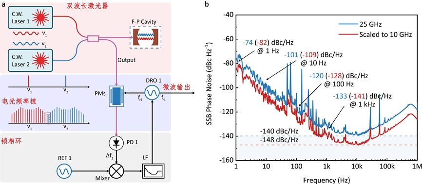 在高稳定高相干双波长激光器的基础上,团队利用4.2nm的电光梳将双波长激光器的相对稳定性下转换至微波信号的稳定性,实现高稳定微波信号合成。电光梳的使用大大简化了传统光分频系统的复杂性。由于产生微波信号的相位噪声低于所有商用相位噪声分析仪的噪底,团队研制了两套独立的系统进行拍频相位噪声表征。最终,产生的25GHz微波信号的相位噪声达到-74dBc/Hz@1Hz,分数频率不稳定性达6E-14@1s,与当前时间频率计量领域最好的氢钟秒稳相当,代表着双点分频法的国际最高水平。
