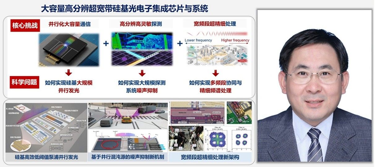 在大容量通信方面,采用铝镓砷异质键合硅基技术,将硅基集成光梳的泵浦阈值降低至毫瓦级,实现硅基高效低阈值并行发光,实现片上2Tbps的大容量信息传输。在高灵敏探测方面,提出基于并行混沌光源的噪声抑制新机制,显著降低激光雷达系统的串扰,实现毫米级精度的耐干扰探测,推动自动驾驶、遥感等领域发展。在宽频段处理方向,提出微波-光波融合架构,研制出光电全集成微波光子处理系统,攻克多频段协同与精细频谱调控难题,为6G通信和雷达系统提供关键技术支撑。