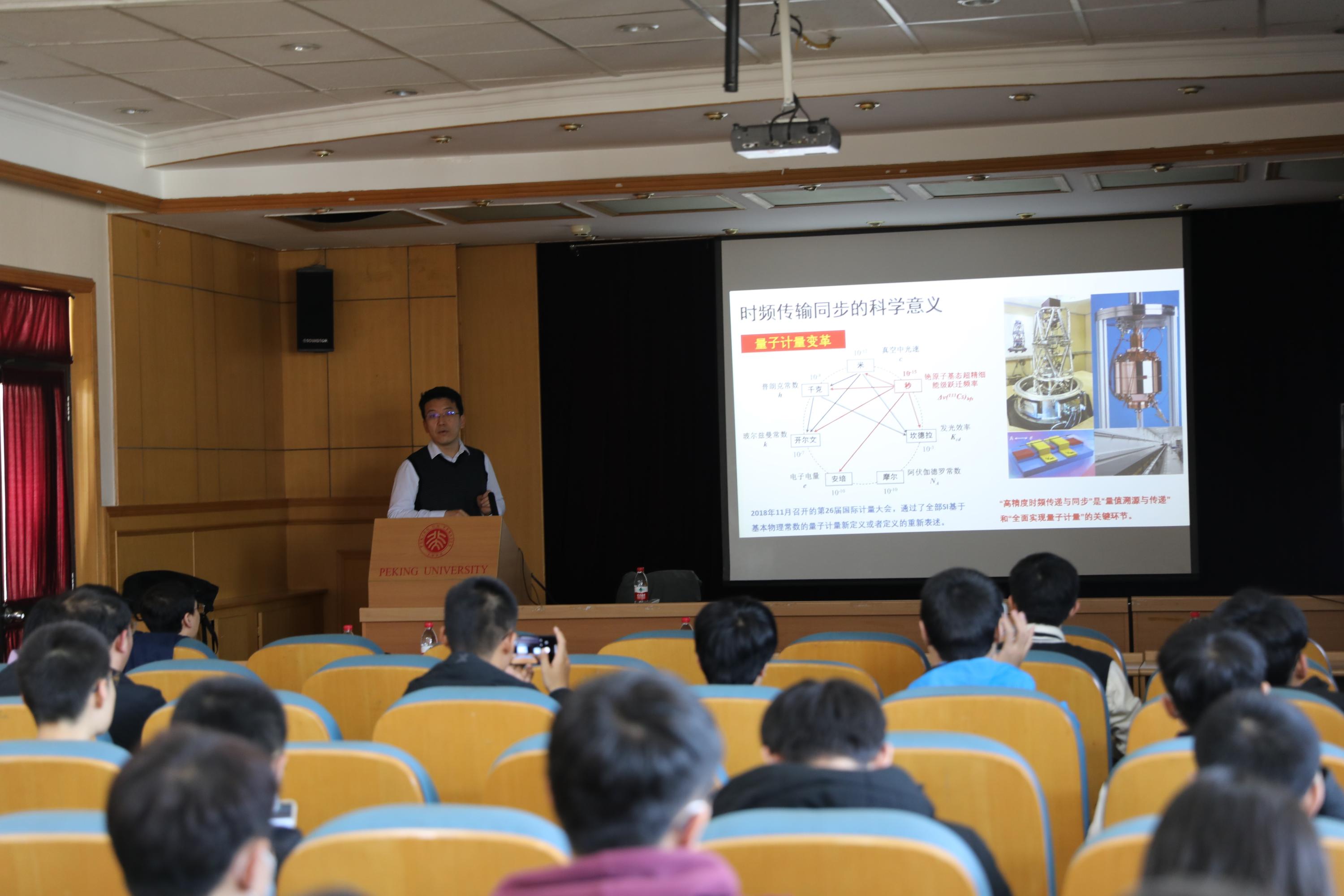 讲座开始,王波副教授为师生从频率、时标、相位等三同步、及在时频城域网上、平方公里阵上、网络化振动监测方面等三应用介绍了整场报告的提纲。从时标、频率、相位的含义与联系入手,介绍了时频传输同步的科学意义。针对频率传输同步定位——异地原子钟的常态化、各种光纤频率同步方法等进行了比对,介绍了各自的优点、缺点及相应应用。