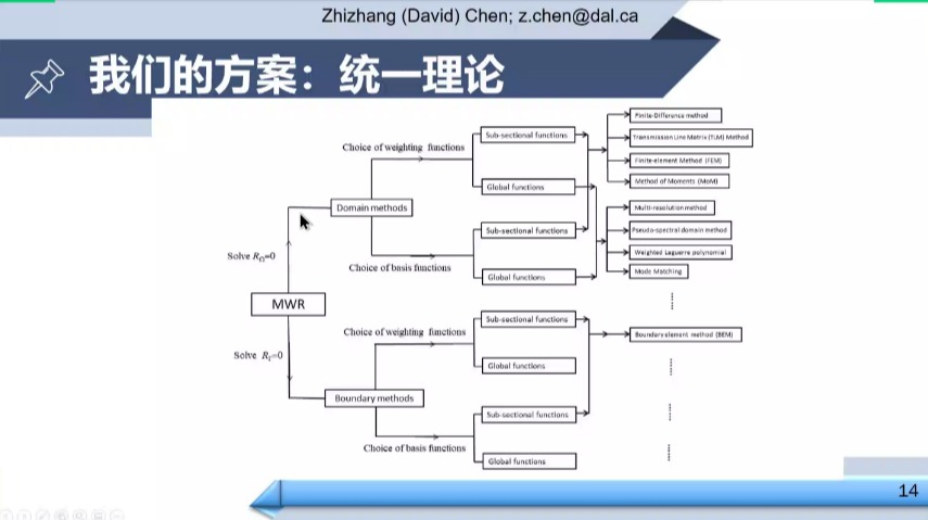 陈教授接着详细介绍了一种统一的方法:使用加权余量法(MWR)推导不同的数值方法,并且使用基于节点的无网格方法的统一计算平台。加权余量法主要分两步:函数展开和误差最小化。FEM、FDTD和MoM等广泛应用的方法,都是可以看作是加权余量法的特例,只是基函数和检测函数在空间和时间上有所不同。接着,陈教授介绍了基于节点的无网格方法,区域不用格子和线来区分,而是用一些点。这种方法可以将有限元和有限差分方法的网格剖分包含进来。将加权余量法和无网格方法结合,可以建立统一的计算平台。对PEC的H型腔体数值测试结果显示,所提出的方法是有效的。