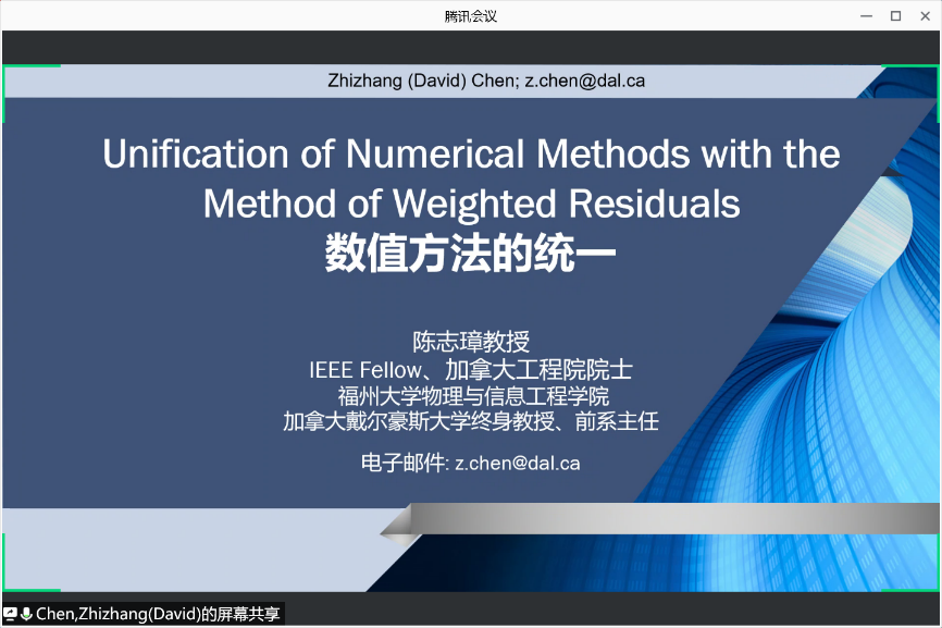 前沿学术论坛第二十三期通过网络顺利举行。本期论坛邀请到IEEE Fellow、加拿大工程院院士、福州大学物理与信息工程学院特聘教授、加拿大戴尔豪斯大学终身教授陈志璋做主题为“Unification of Numerical Methods with the Method of Weighted Residuals (基于加权余量法的数值方法的统一) ”和“中长距离无线能量传输-电磁技术与应用”的学术报告。讲座由18漫画
