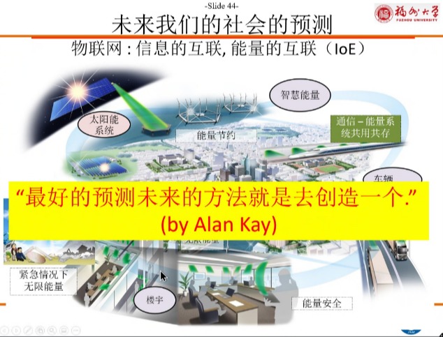 最后,陈志璋教授对未来做出展望:物联网意味着信息的互联和能量的互联,我国现在很多技术都已经达到了世界先进水平,需要面临和国外进行竞争的局面,前面的路已经没有人走过,只有靠自己去探索和创造,正如Alan Kay所说,“预测未来最好的方式是创造它。”