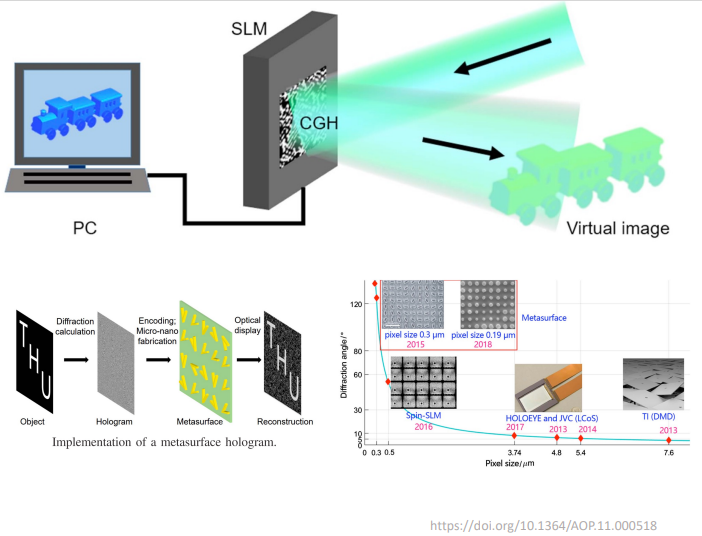 接下来,曹老师从元宇宙、人工智能、全息成像与量子信息四个角度展开讲述智能光子技术在科学研究与产业转化中的应用。首先介绍了元宇宙在现代信息社会中的应用,并展示了相关企业的产品。随后,曹老师从动态高分辨率计算全息显示的关键技术出发,结合团队多年的研究成果,提出传统全息技术、成像技术与人工智能算法、超表面和多维复用器件结合的研究思路。