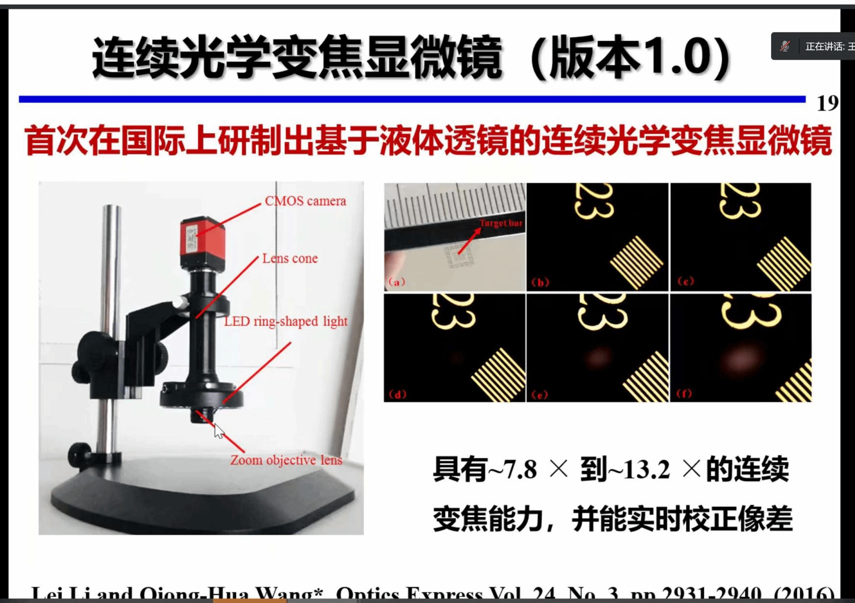 基于该液体透镜,王教授研究组首次在国际上研制出基于液体透镜的连续光学变焦显微镜,并且能实现矫正像差。