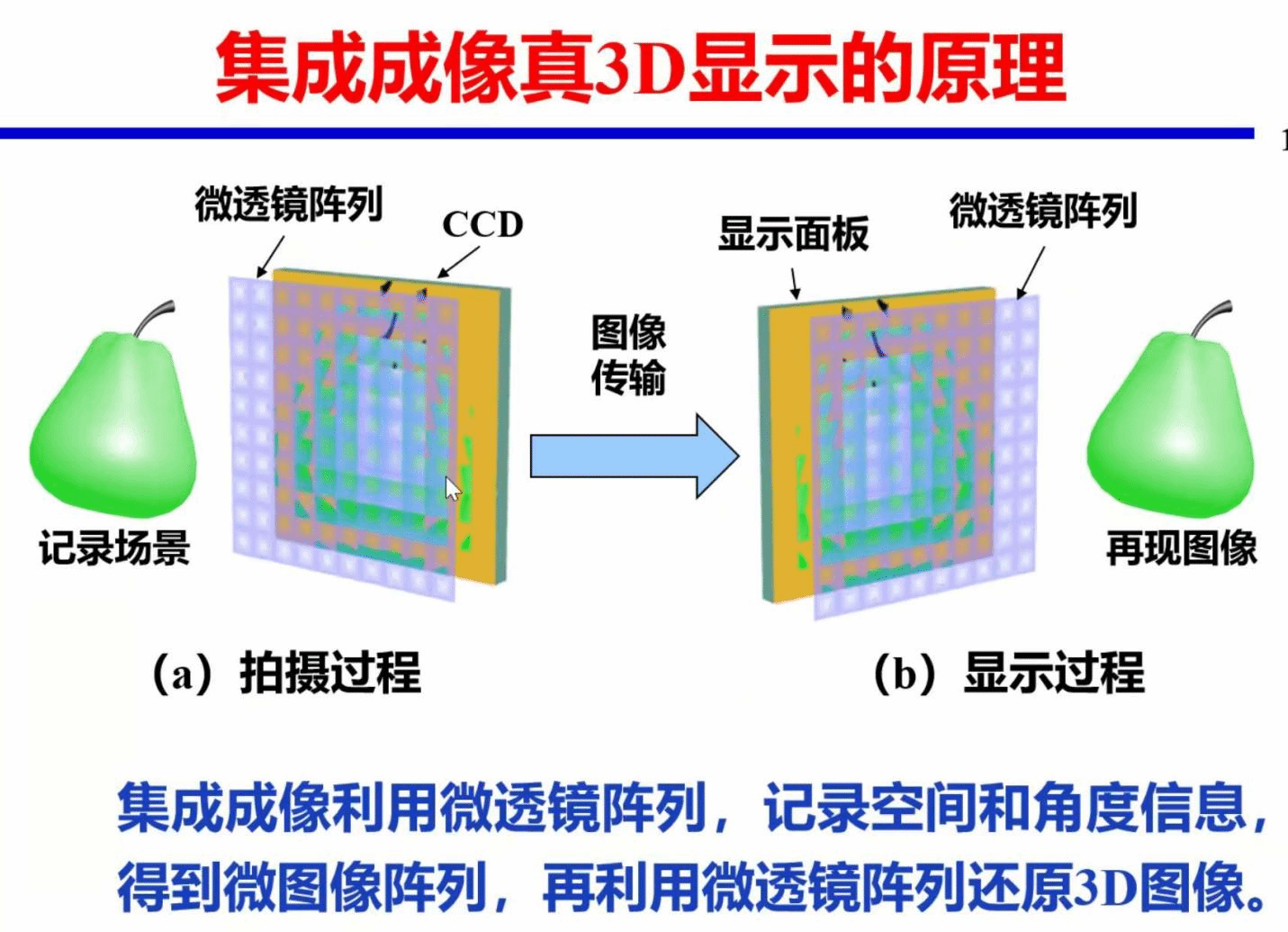 现今广泛应用的3D显示技术如人戴眼镜的助视3D、屏戴辅助的常规裸眼3D等存在视角受限、立体视疲劳、需要辅助设备等问题。集成成像及全息技术先重构实际物体的光线传播分布,再在显示器上辐射,与实际物体的光线接近,因此不会产生眩晕,并且集成成像真3D具有着准连续视点、全视差、全彩色、结构简单及成本低等显著优点。