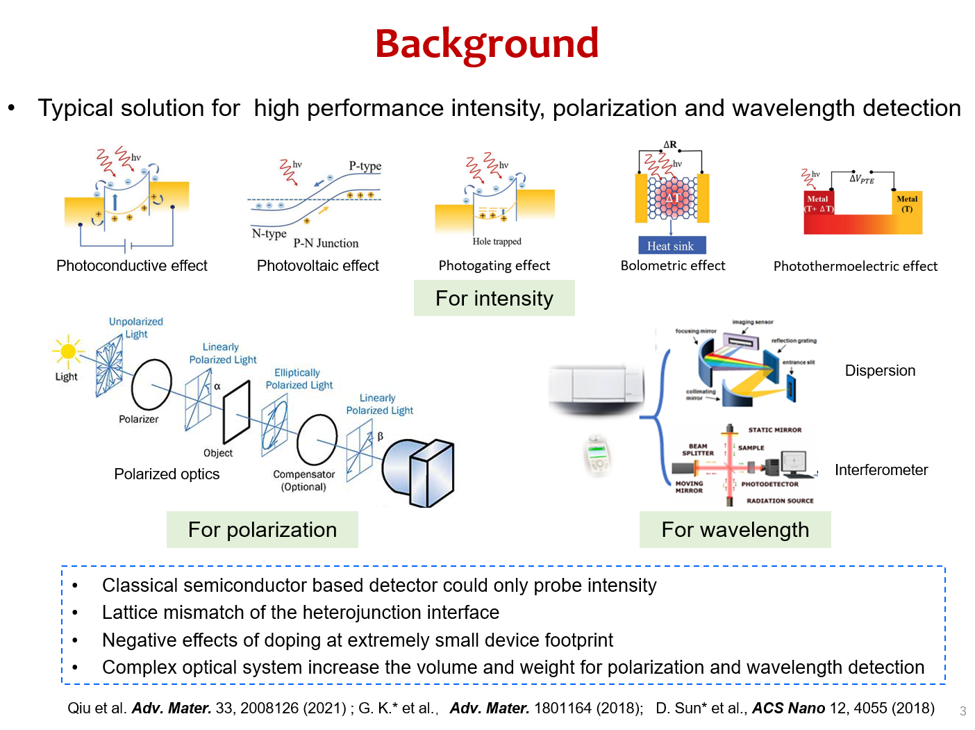 张教授首先介绍了研究背景。他指出,人们在感知外部世界时,超过60%的信息来自视觉,可以说,人眼是最智能化的光电探测器,光电探测器具有广泛的应用领域和重要的作用。目前,绝大部分探测器仅停留在对光强的探测,而光本身具有许多其他重要信息,例如偏振、相位和波长。如何进一步深入研究探测器,以获取更为丰富的光信息呢?在回答这个问题之前,张教授先介绍了二维材料相比其他材料具备的独特优势,其优势主要有三:一是表面无悬挂键,支持自由堆叠;二是面内晶格不对称性引起光学和电学的各向异性;三是调控能带结构较为容易。