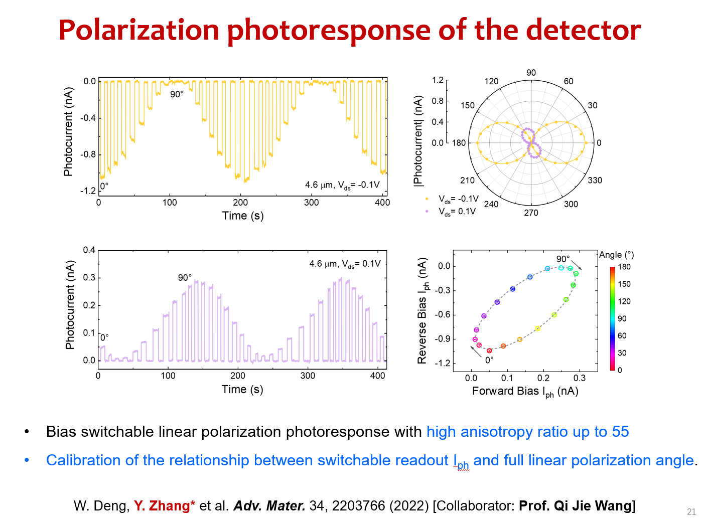 关于偏振光响应探测器,张教授讲到,针对30°和150°的偏振光无法准确区分这一类问题,张教授课题组采用黑砷磷(b-AsP)交叉结构构造二维张量,从而实现对不同角度偏振光的精确探测。针对交叉结构暗电流较大的问题,可以引入单极性势垒,减小暗电流,信噪比得到了提高。张教授课题组通过实验证明,这种方式可以精确标定偏振光角度。